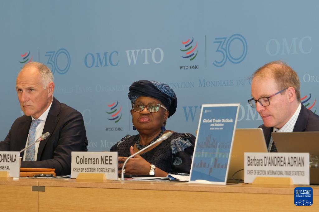 10月7日,在瑞士日內瓦世界貿易組織總部,世貿組織總干事伊維拉(中)在新聞發布會上講話。新華社記者 馬汝軒 攝
