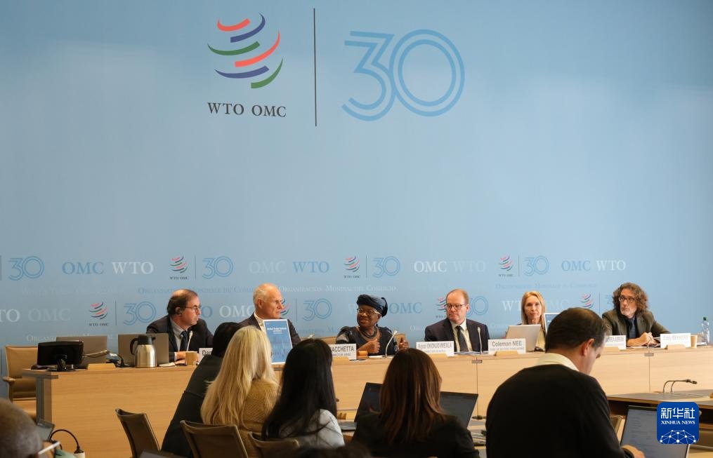 10月7日,在瑞士日內瓦世界貿易組織總部,世貿組織總干事伊維拉(后左三)在新聞發布會上講話。新華社記者 馬汝軒 攝