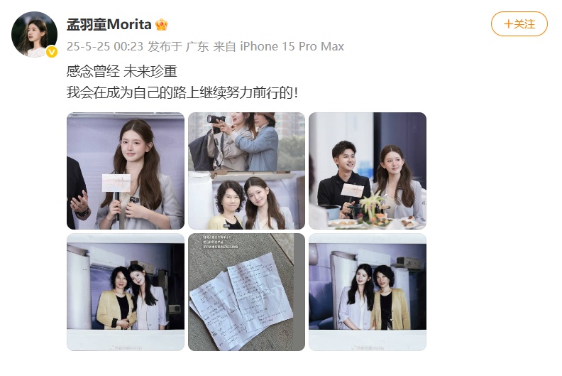 5月25日凌晨,孟羽童曬與董明珠合照,并配文:“感念曾經,未來珍重。我會在成為自己的路上繼續努力前行的!”