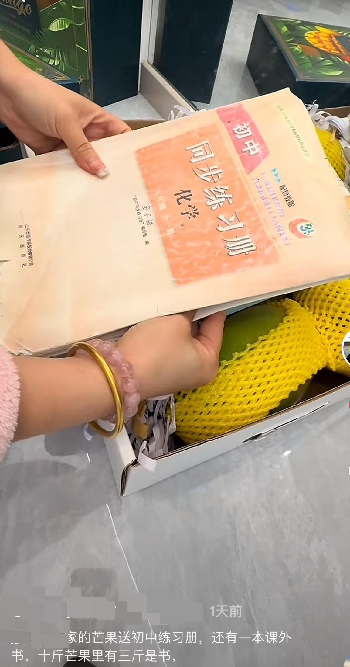多名網(wǎng)友發(fā)布的視頻顯示,打開禮盒外包裝后,里面放著數(shù)個(gè)芒果,下方墊著紙絲和一些吸水紙,在吸水紙下方,則疊放著來(lái)歷不明的書本和紙張,有批改后的散裝學(xué)生作業(yè)、試卷,也有使用過(guò)的《5年中考3年模擬》成冊(cè)試卷,還有《語(yǔ)文》和六年級(jí)《道德與法治》教科書等。一名網(wǎng)友配文稱,刷抖音看到芒果禮盒里有書本的視頻后,打電話讓家人看看自己買的禮盒,發(fā)現(xiàn)也有小學(xué)練習(xí)冊(cè)。另有網(wǎng)友通過(guò)社媒稱,買芒果送初中練習(xí)冊(cè),十斤芒果里有三斤是書。因所購(gòu)買的芒果禮盒,不少為國(guó)慶中秋假期走親戚之用,有網(wǎng)友將其稱為“斷親禮盒”。