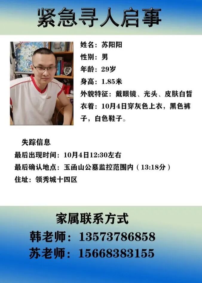 10月8日,其家屬告訴記者,蘇陽陽今年29歲,家住濟南領秀城十四區,最后出現的時間是10月4日12:30左右。監控畫面顯示,當日13:18左右,蘇陽陽從濟南玉函山公墓進入玉函山后失聯。