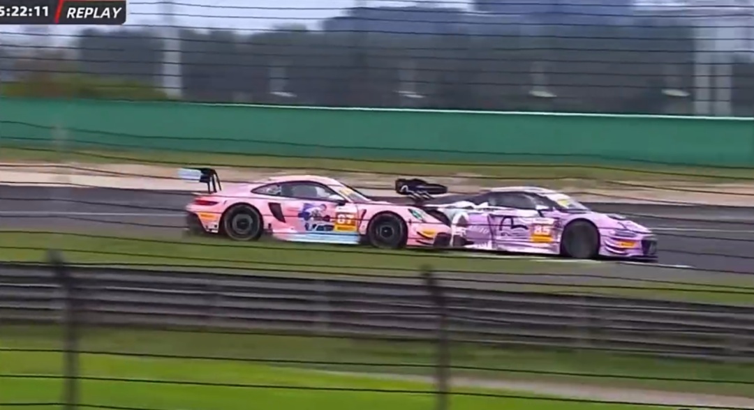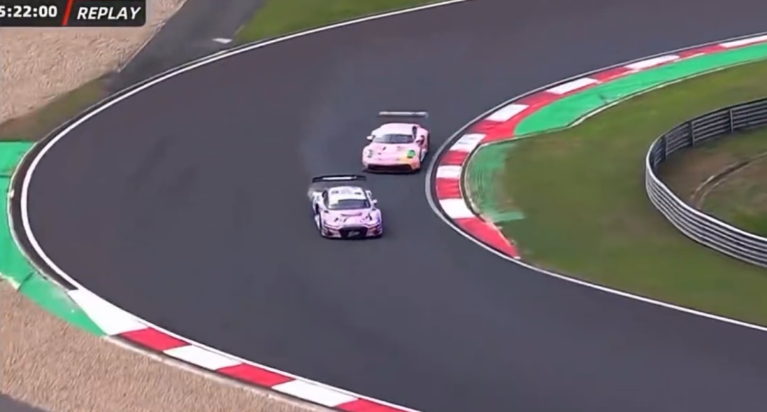 視頻顯示,85號賽車右后輪胎與87號賽車輪轂產生剮蹭,碰撞造成賽車右后輪拱及擴散器受損,車胎與車身部件摩擦產生高溫隨即冒煙。