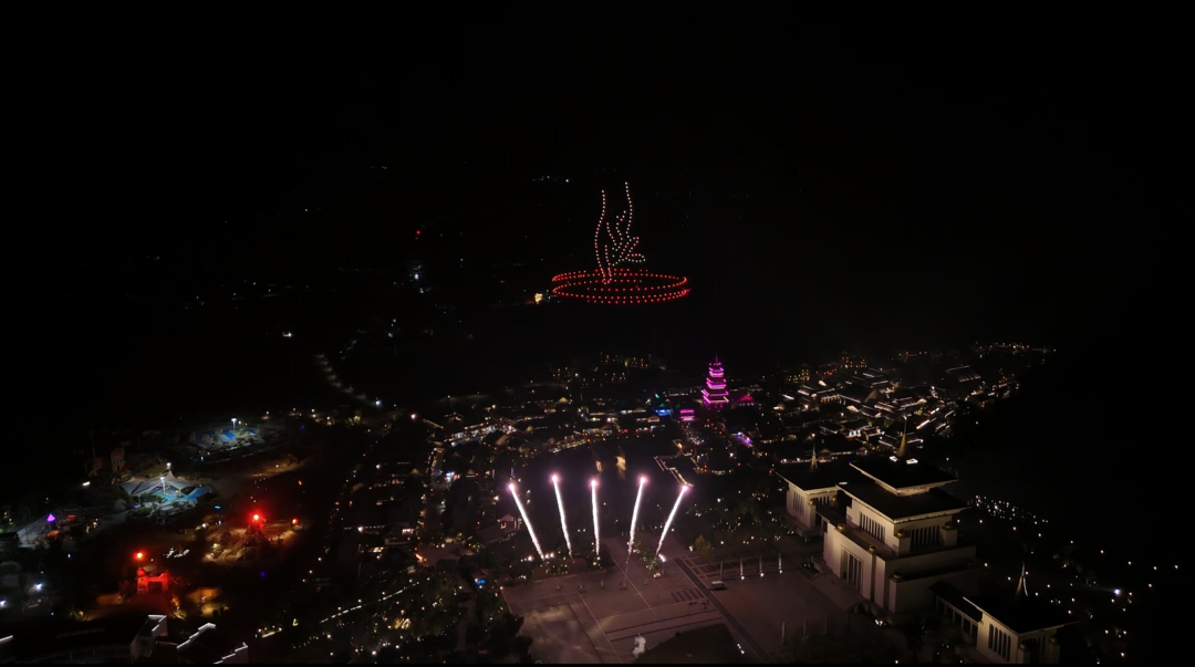 夜空下,東山問梅村的璀璨仍在繼續(xù):數(shù)百架無人機騰空而起,次第變幻出黃梅戲經(jīng)典角色、五星紅旗、靈犀一指等圖案,與打鐵花等表演交相輝映,引來掌聲如潮。全新編排的水幕黃梅戲《白蛇問情》中,白娘子踏水而來的數(shù)字光影,讓杭州游客王先生直呼“像走進了傳說里”。