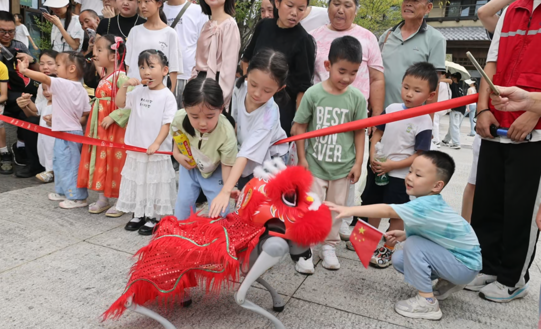 大戲臺前,一場跨越古今的對話正在上演。江西游客李女士的孩子,正與機器狗互動。“原本擔心孩子對戲曲不感興趣,沒想到機器人一亮嗓,唱起《女駙馬》,他立馬就被吸引住了!”李女士驚喜地說。一旁,機器狗踩著鼓點“舞獅”,機械舞獅隊靈動騰躍,科技與傳統(tǒng)的碰撞,引來游客陣陣掌聲與合影。