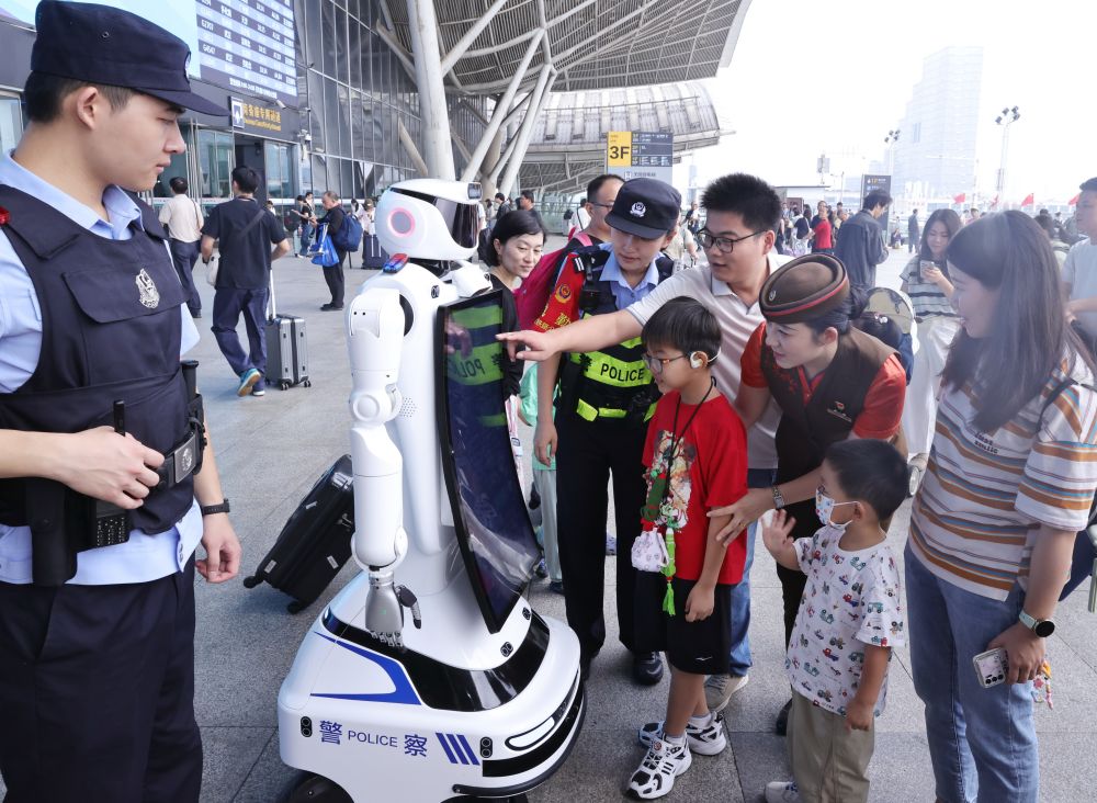 10月1日,在湖北省武漢站,小朋友和機器人互動。新華社發(趙軍攝)