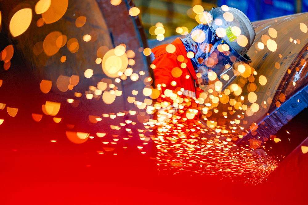 這是10月1日,在天津市濱海新區,渤海油田工人進行打磨作業。新華社發(杜鵬輝攝)