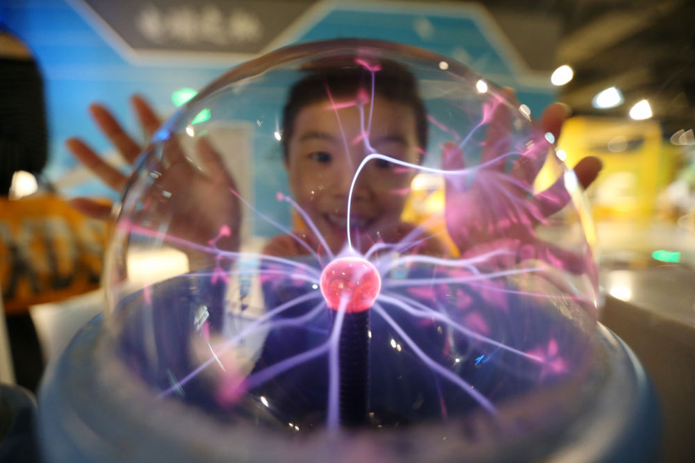 10月3日,小朋友在江蘇揚州科技館體驗“輝光球”。新華社發(孟德龍攝)