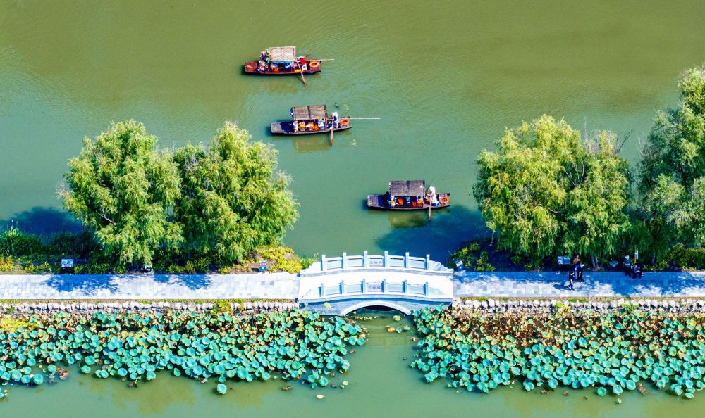 10月7日,游客在江蘇興化里下河國家濕地公園乘船游玩(無人機照片)。新華社發(周社根攝)