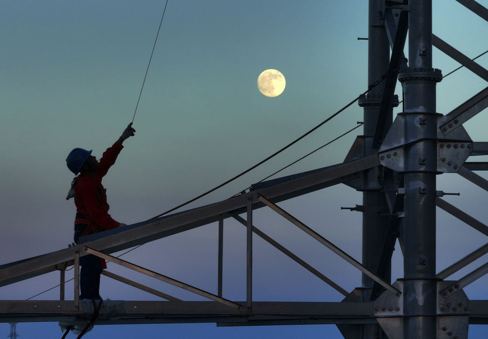 10月6日,在湖南省衡陽市雁峰區,高塔架線工人在月光的映射下施工(無人機照片)。新華社發(曹正平攝)