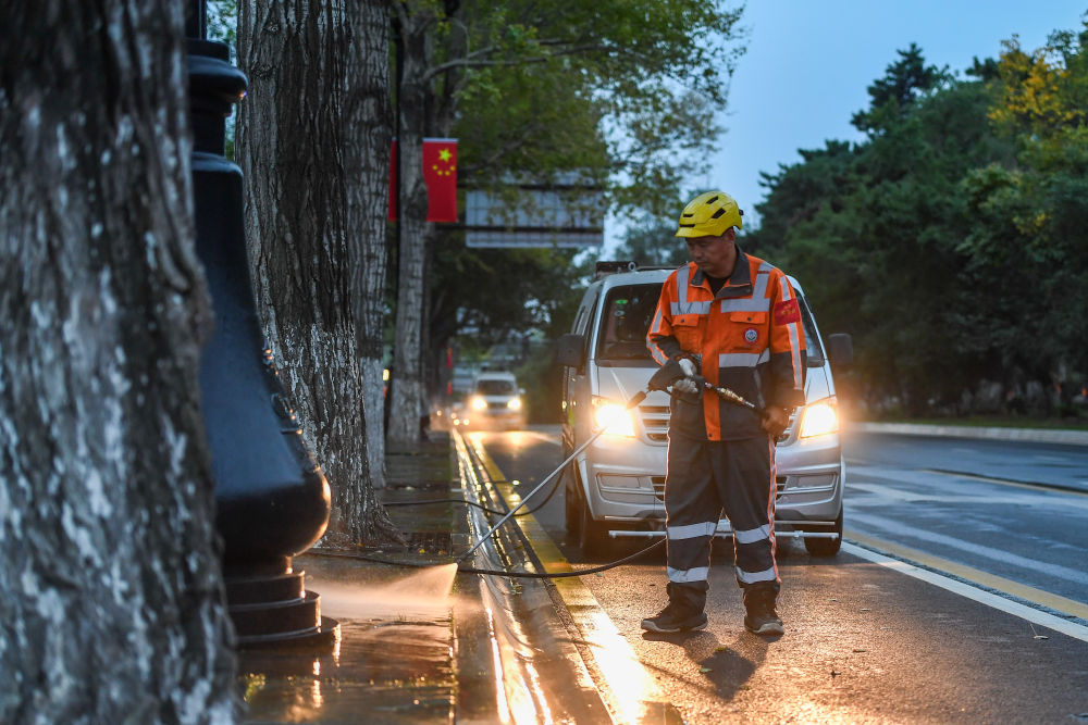 10月1日,環衛工人在吉林省長春市朝陽區新民大街清掃人行步道。新華社記者 張楠 攝