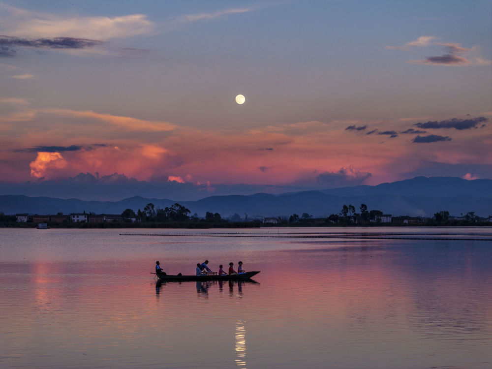 10月6日,人們乘船在云南大理洱源西湖賞月(無人機照片)。新華社發(羅新才攝)