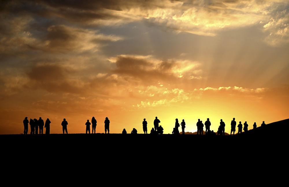 這是10月2日清晨,游客在甘肅省敦煌市鳴沙山月牙泉景區觀賞大漠日出美景。新華社發(張曉亮 攝)