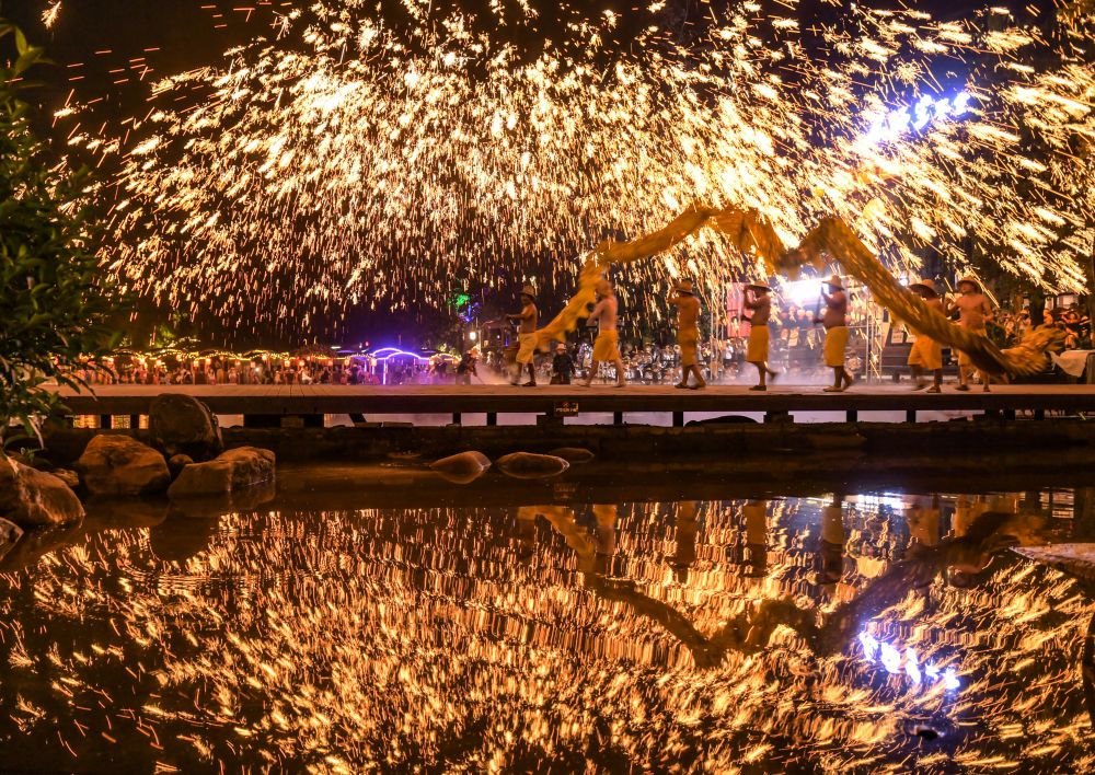 10月5日晚,在四川省成都市雙流區黃龍溪古鎮,民間藝人為游客表演非遺“火龍燈舞”。新華社發(李向雨攝)