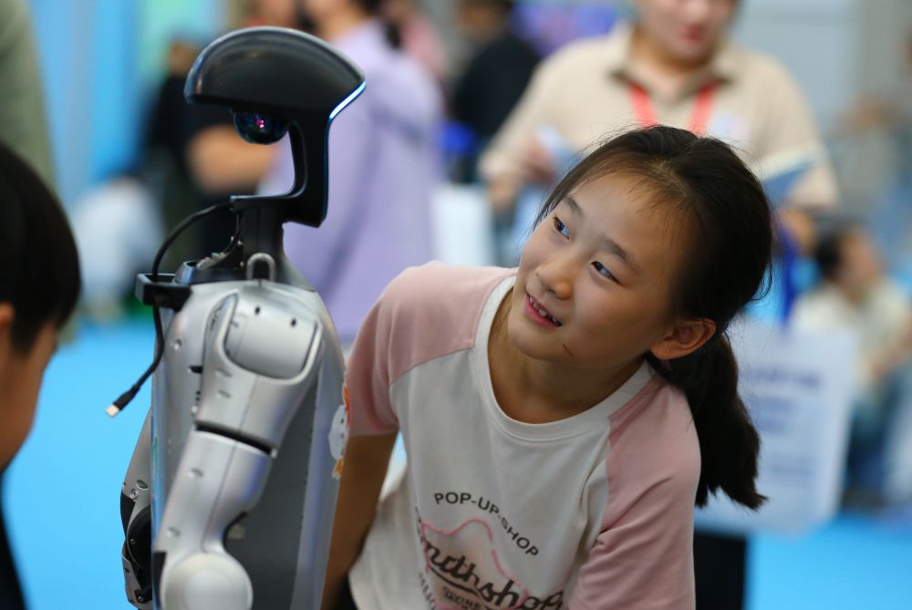 10月2日,在山東省第九屆滕州書展現場,小朋友與機器人互動。新華社發(李志軍攝)