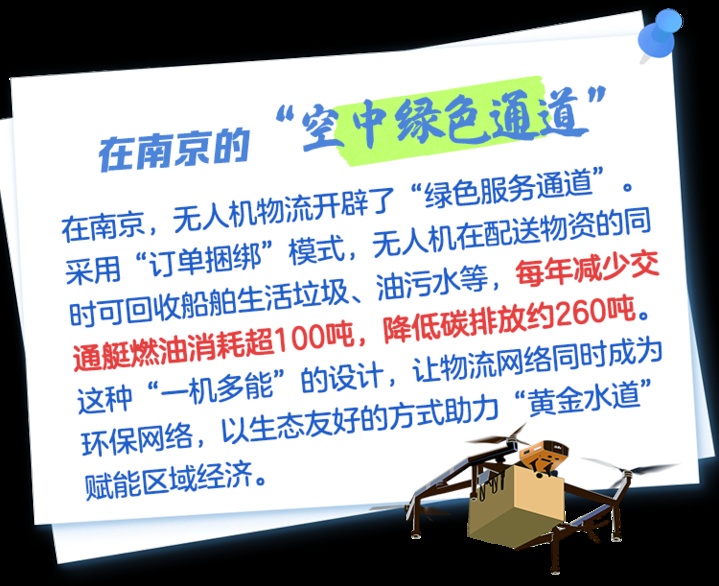 在南京鼓樓區下關濱江江畔的江翼達飛行基地,長江“外賣小哥”方隊整齊列陣,隨著指令下達,5架無人機搭載著新鮮的果蔬、包裝好的快餐等物品,精準飛向長江中航行的船舶。