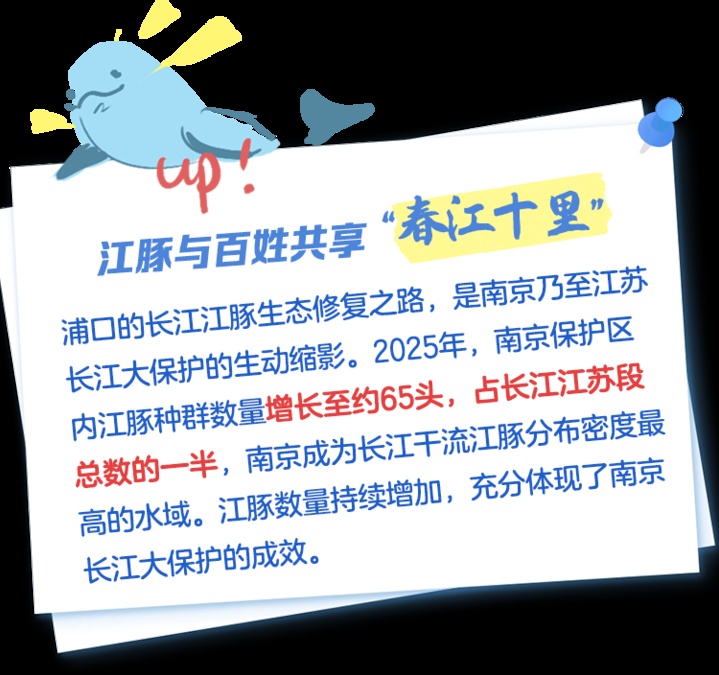 國慶長假,南京各大景區人聲鼎沸,游人如織,每一處熱門景點都上演著“人山人海”的盛況。繁華喧囂之外,在長江浦口段,南京“榮譽市民”——長江江豚,正逐漸迎來一年中最為活躍的時節,悄然展現著它們的生機與活力,訴說著長江與城市共生的智慧答案。假期最后一天,不妨放慢腳步,來到江邊小憩片刻,邂逅“微笑天使”,聽水流里的民生故事,看科技滋養出的民生幸福圖景。