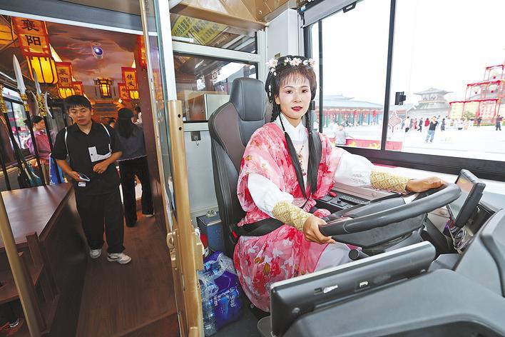 10月5日,襄陽公交車司機姚玲玲裝扮成“黃蓉”,載著游客來到襄陽唐城景區。(視界網 楊東 攝)