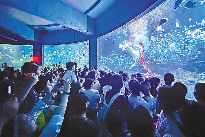 10月3日,海合安武漢極地海洋度假區推出創意表演“水下嫦娥奔月”。(湖北日報全媒記者 倪娜 通訊員 徐平麗 攝)
