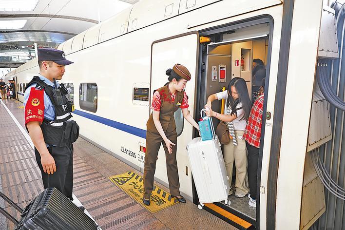 10月7日,武昌站內列車乘務員貼心服務旅客。 (湖北日報全媒記者 魏錸 攝)