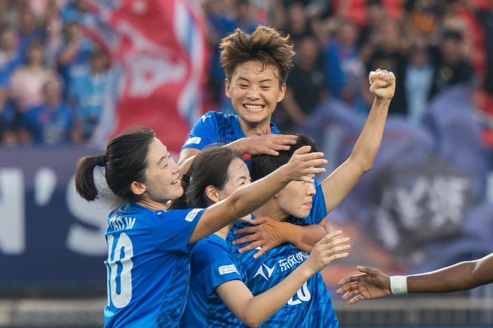 10月8日,武漢車谷江大隊球員姜晨璟(左二)進球后與隊友姚偉(左一)、王霜(上)、金惠利慶祝。新華社記者 杜子璇 攝
