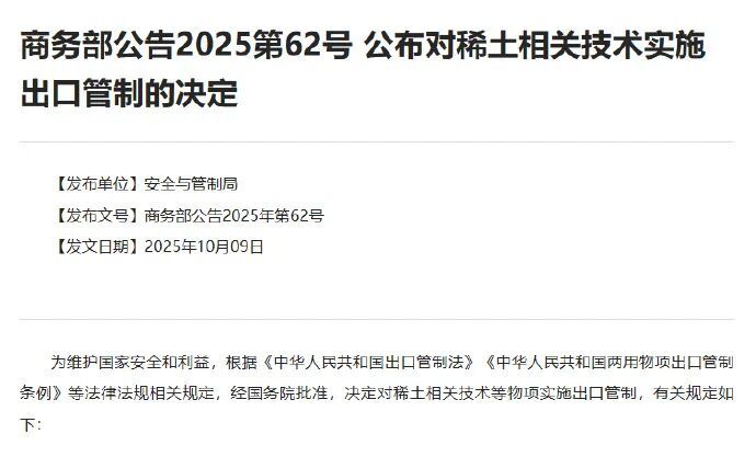為維護國家安全和利益,根據《中華人民共和國出口管制法》《中華人民共和國兩用物項出口管制條例》等法律法規相關規定,經國務院批準,決定對稀土相關技術等物項實施出口管制。