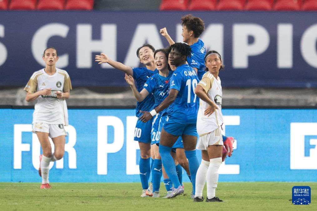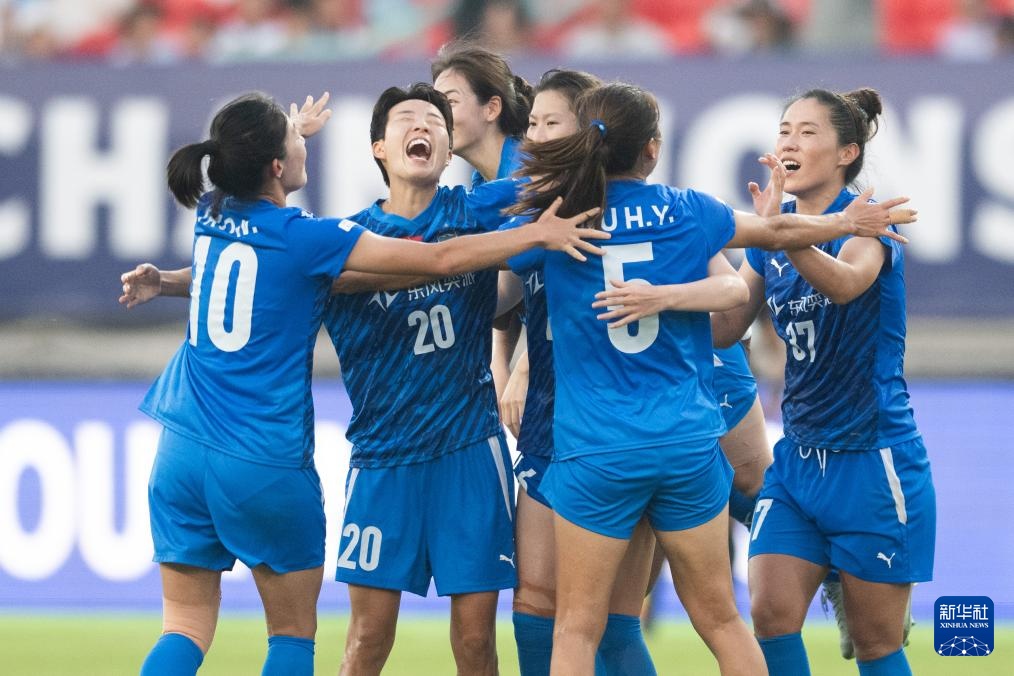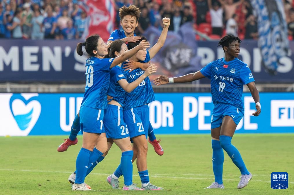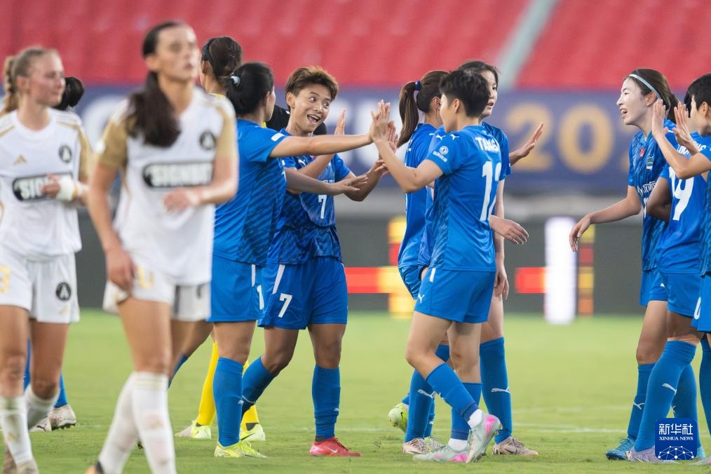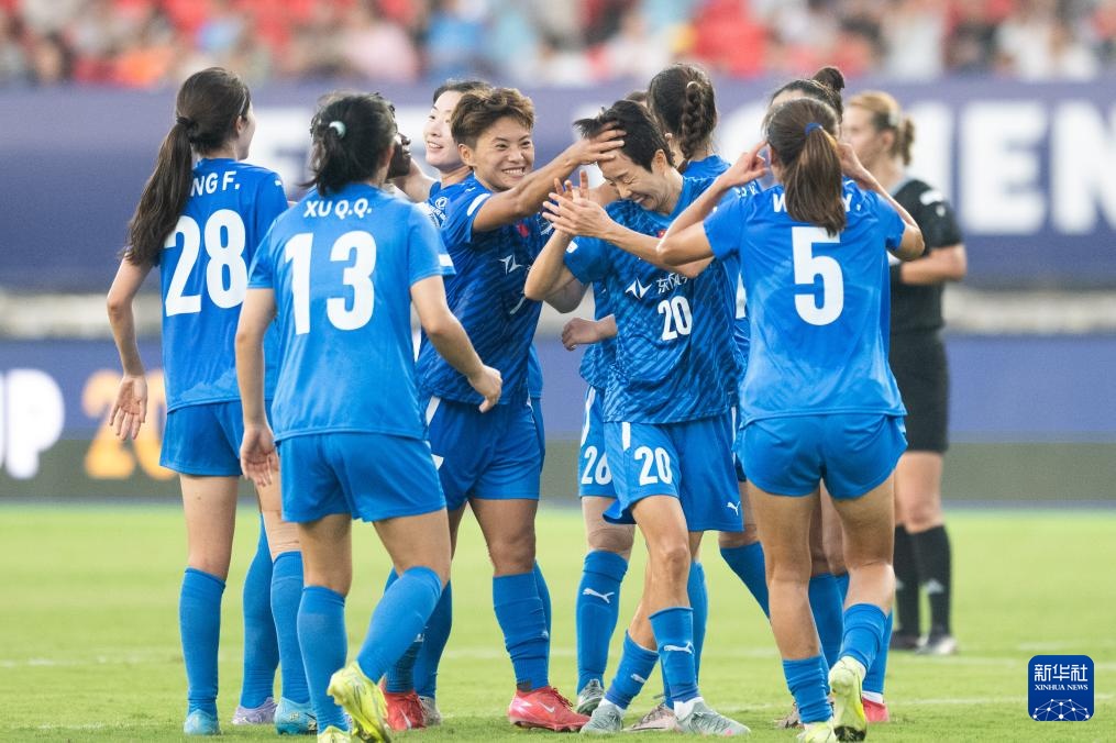 10月8日,武漢車谷江大隊球員王霜(中)與隊友金慧利慶祝球隊得分。