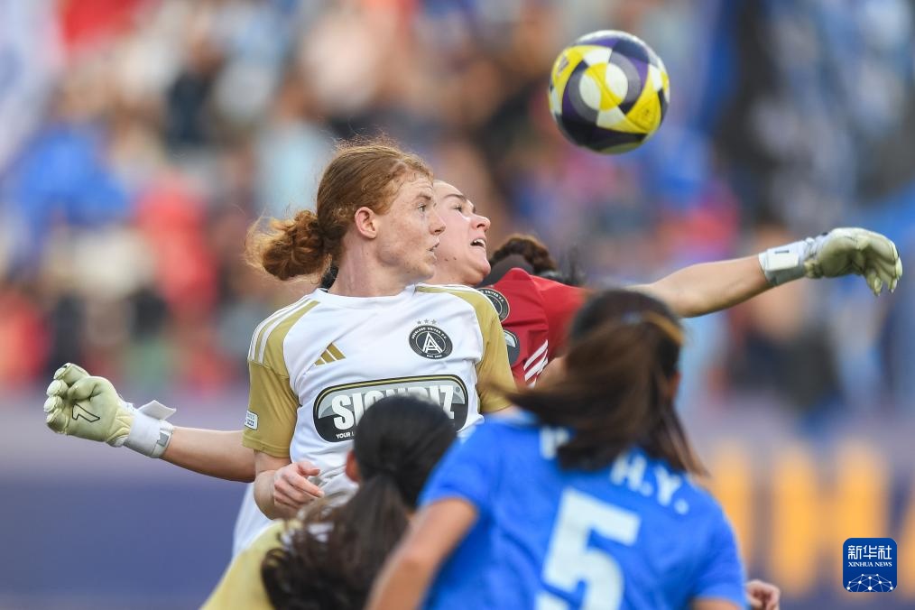10月8日,武漢車谷江大隊球員鄧夢曄(左)與奧克蘭聯(lián)隊球員格蘭杰(右)爭頂。