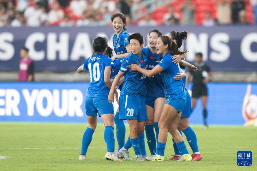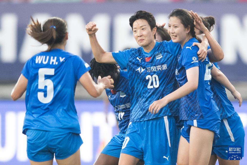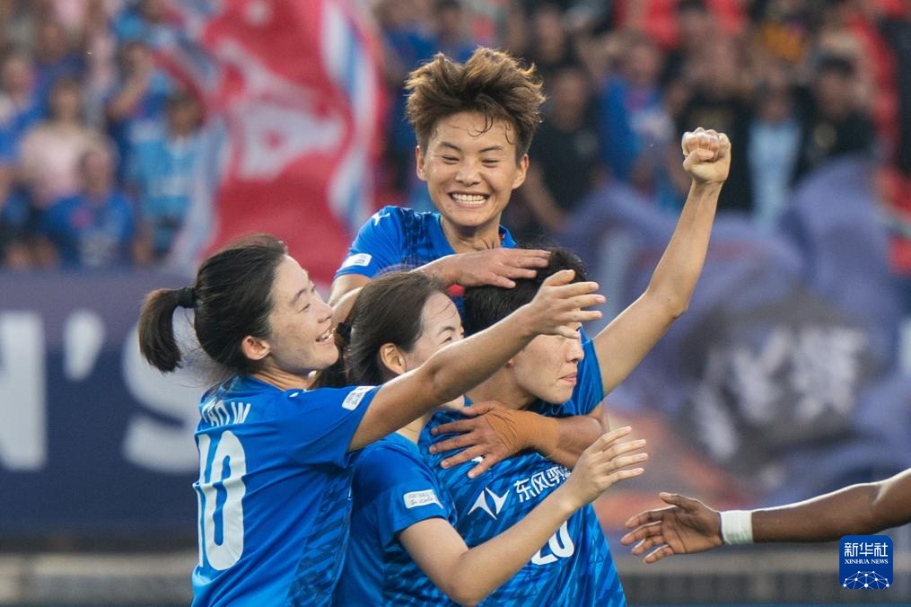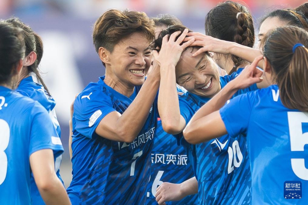 10月8日,武漢車谷江大隊球員王霜(中)在賽后與隊友慶祝。