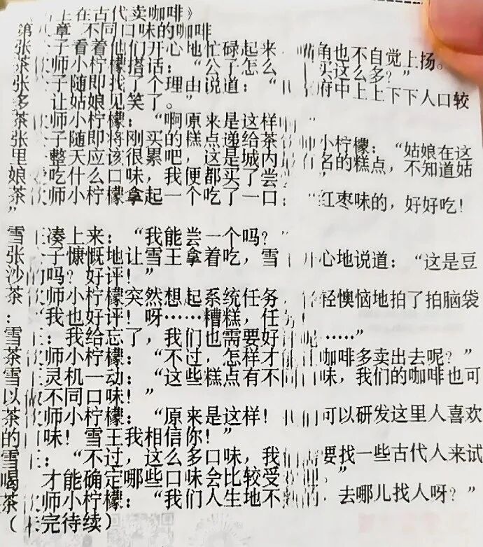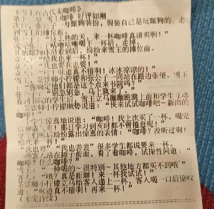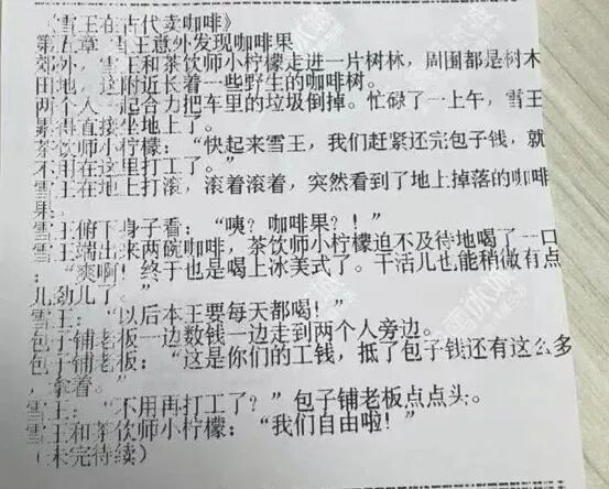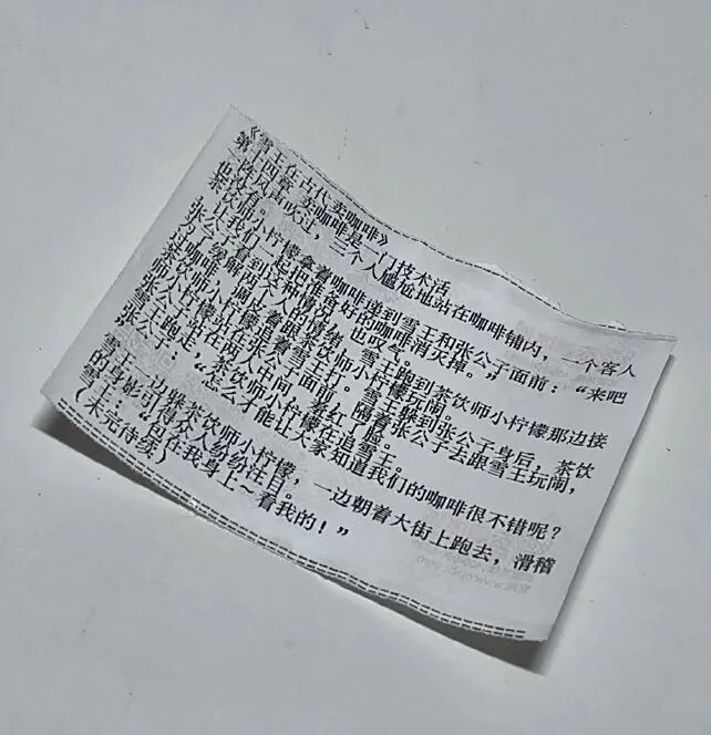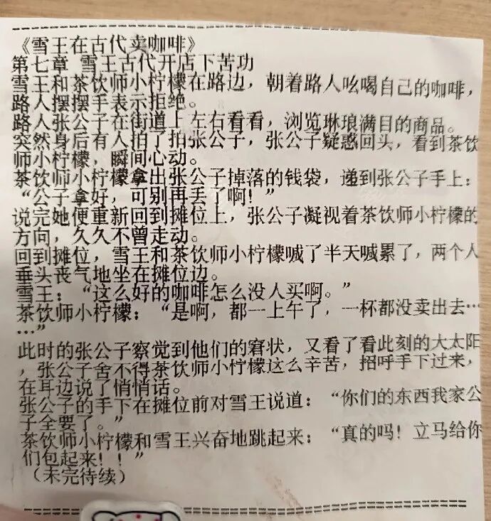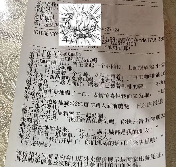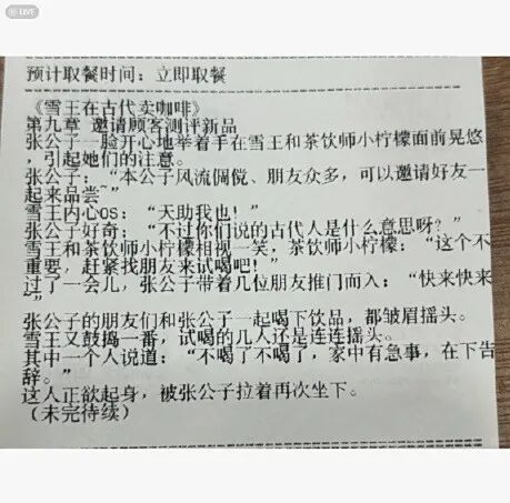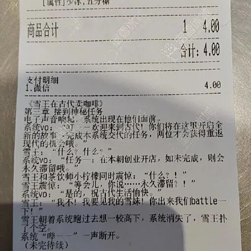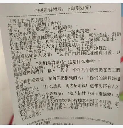近日,有網友在社交平臺發帖求助,稱購買蜜雪冰城奶茶時發現小票上印有連載小說,急切詢問“誰有之前的章節”。