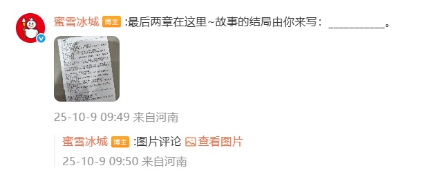 一名網友在社交媒體曬出第20章小說,稱“想看之前的(章節)”。帖子一經發出迅速引發關注,評論區成了“章節交換站”:不少網友曬出自己拍到的其他章節,有人調侃“大家拼拼湊湊,我僅花0元就看完了全文”,還有網友點贊品牌創意,直言“蜜雪招到了很會運營的小朋友啊”。