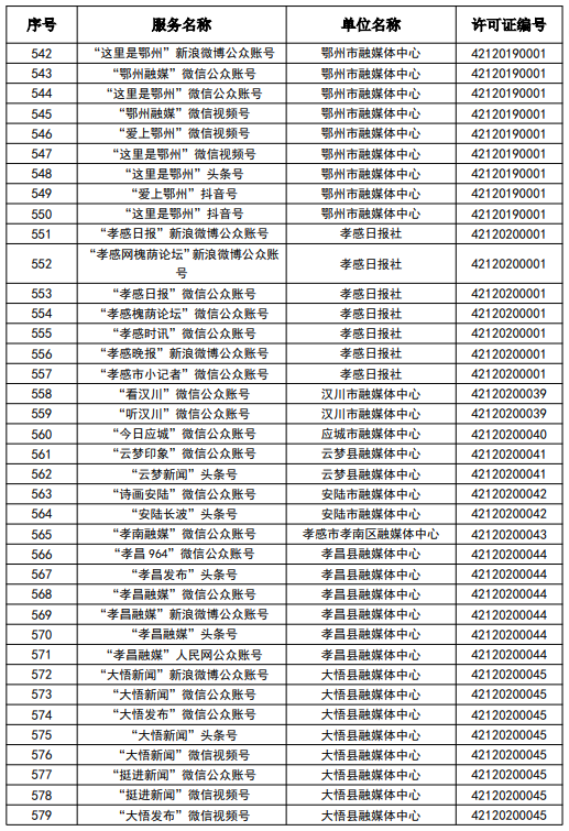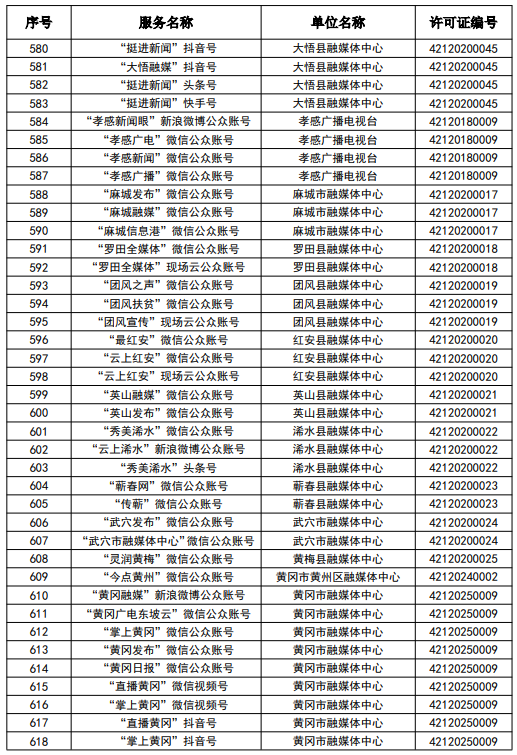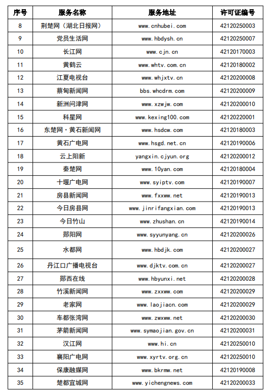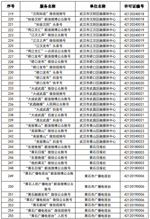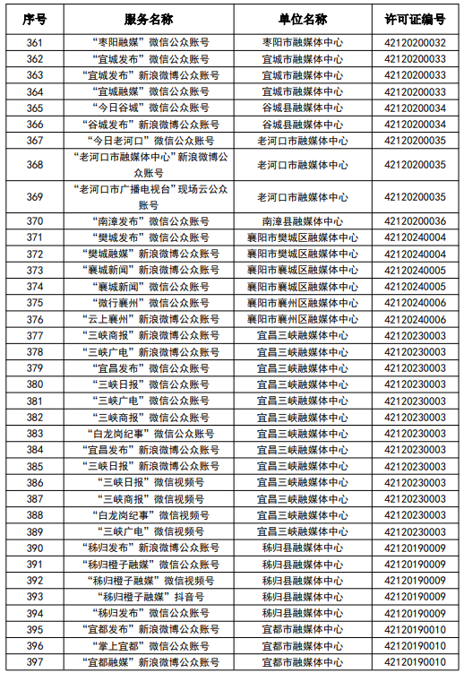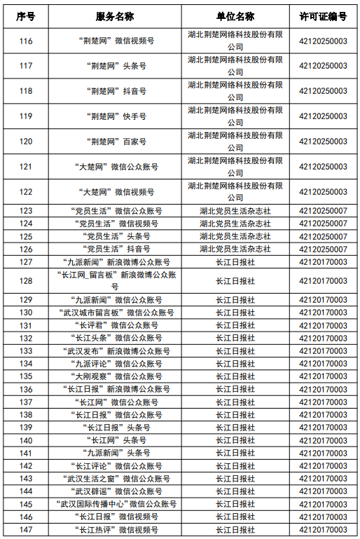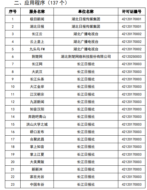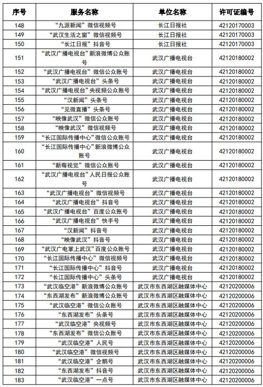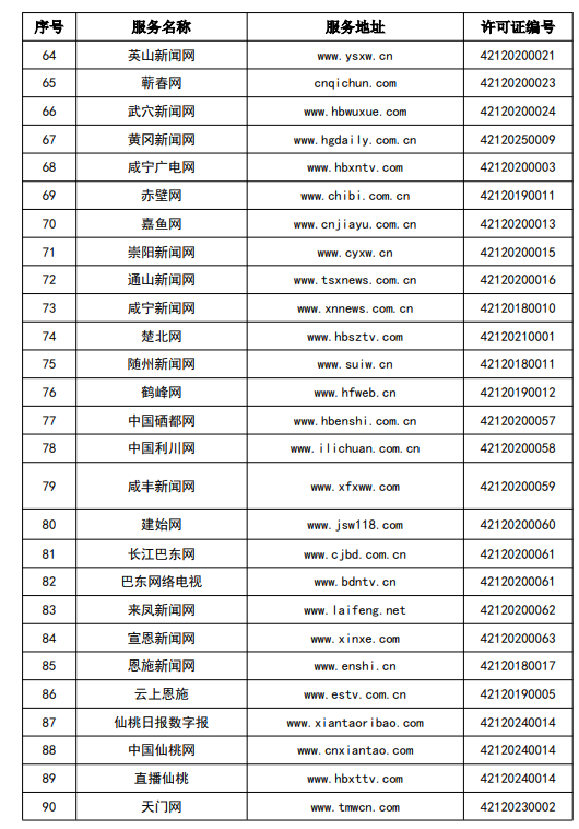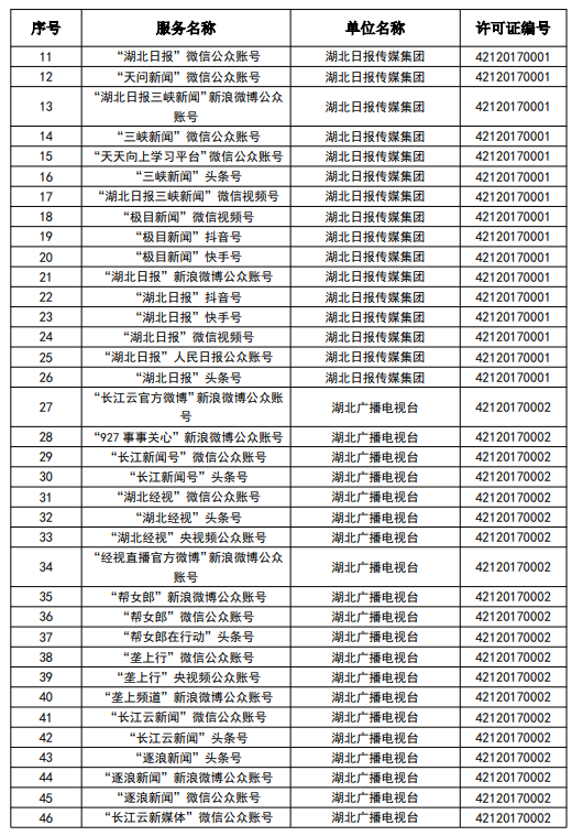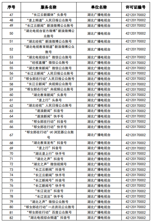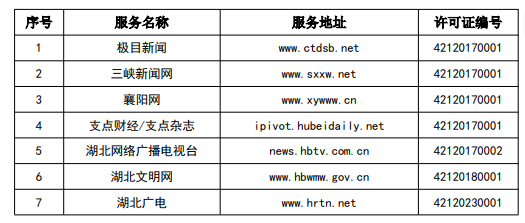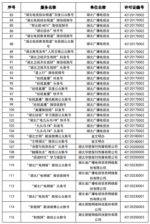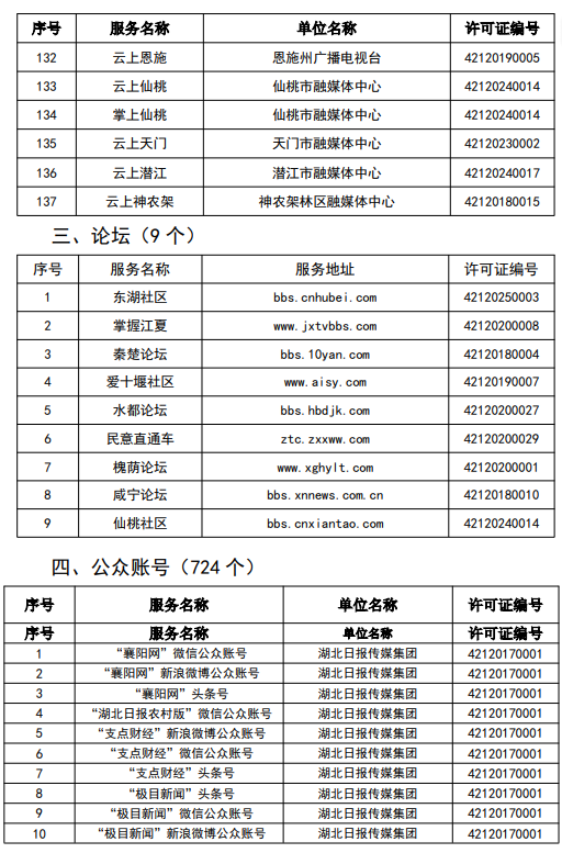 按照國家網信辦統一部署,湖北省網信辦依法組織開展了屬地互聯網新聞信息服務許可證的申請、續辦和變更工作,現將湖北省133家互聯網新聞信息服務單位取得的相關許可信息予以公開,包括:互聯網站92個,應用程序137個,論壇9個,公眾賬號724個,其他3個,共計965個服務項。