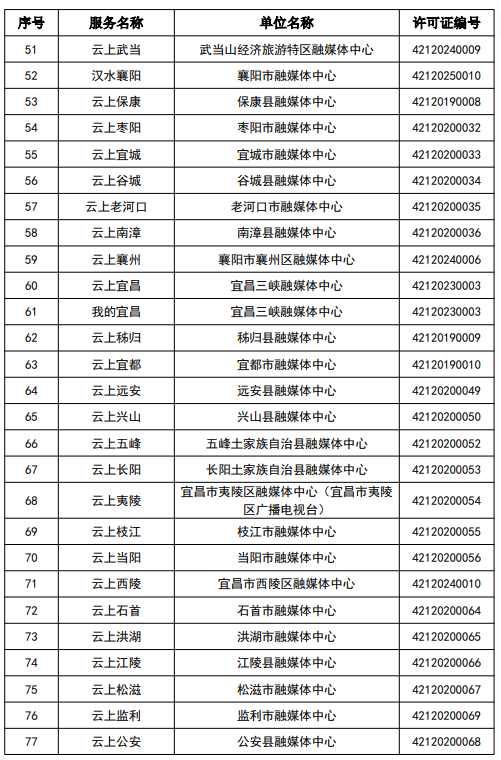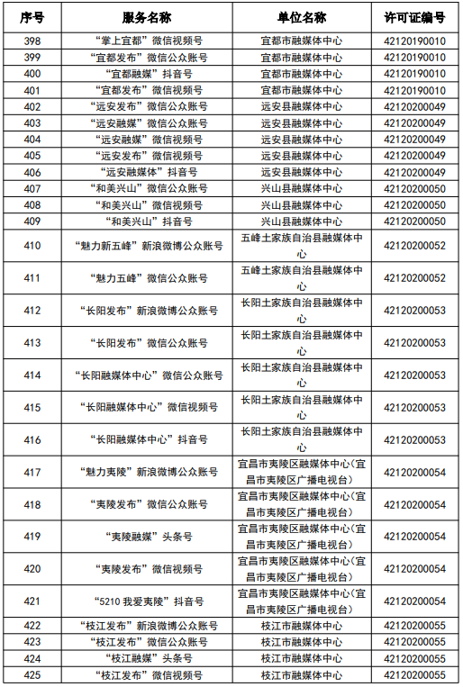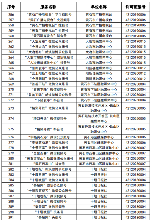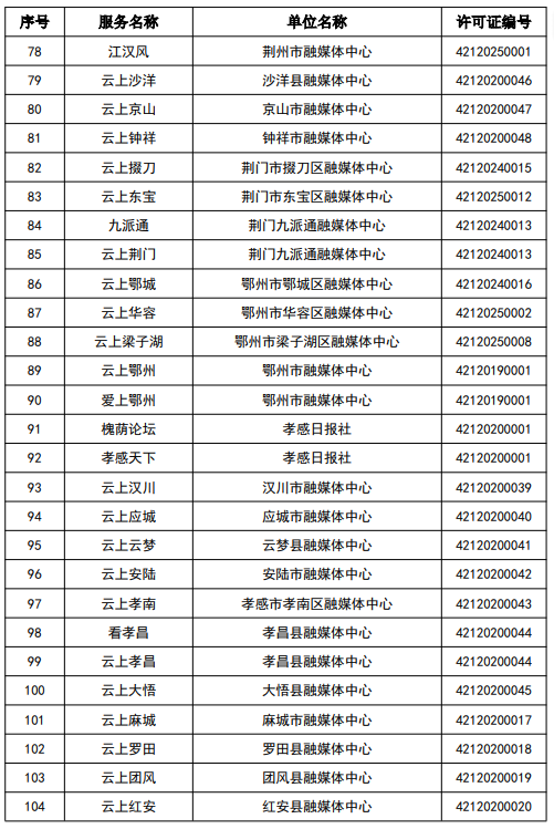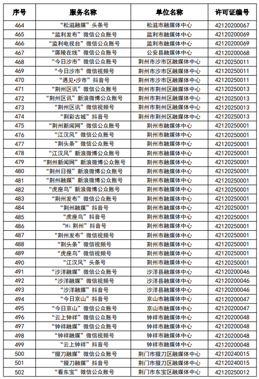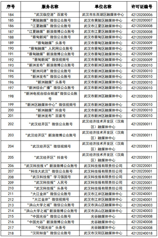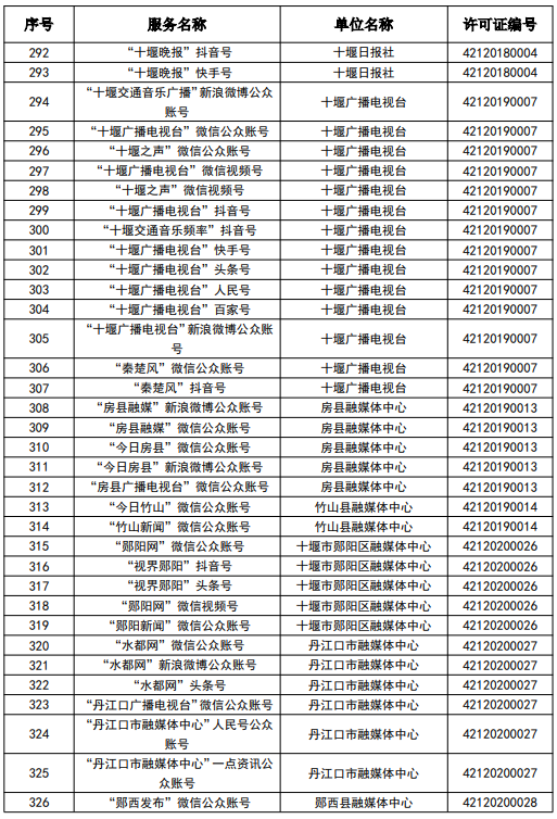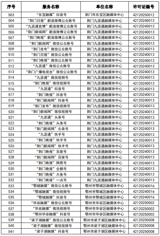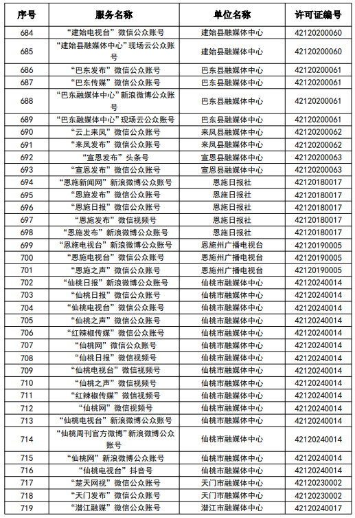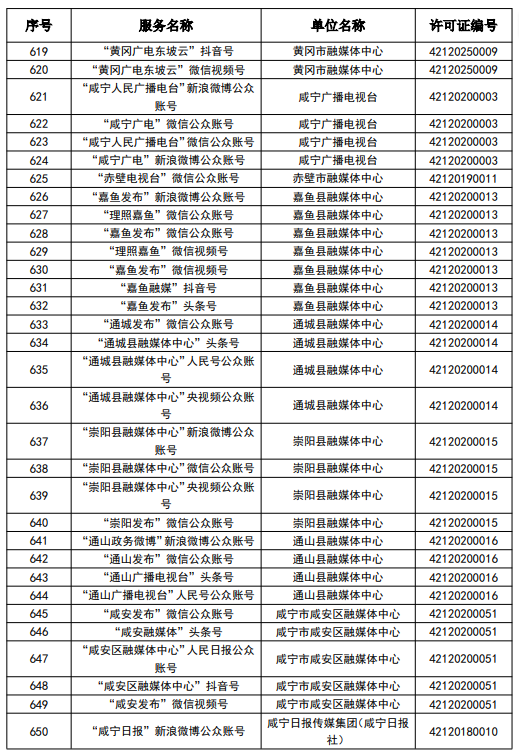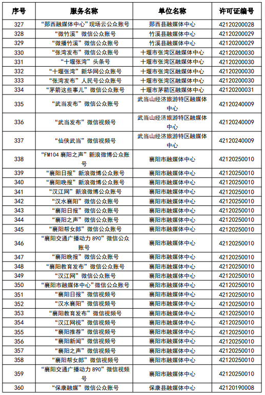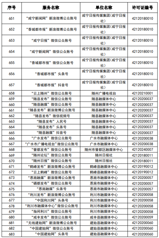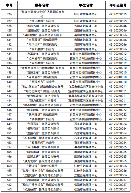 按照國家網信辦統一部署,湖北省網信辦依法組織開展了屬地互聯網新聞信息服務許可證的申請、續辦和變更工作,現將湖北省133家互聯網新聞信息服務單位取得的相關許可信息予以公開,包括:互聯網站92個,應用程序137個,論壇9個,公眾賬號724個,其他3個,共計965個服務項。