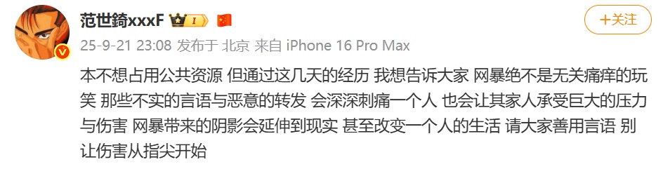 此前,9月11日,范世錡發博悼念好友于朦朧(2013年《快樂男聲》同期選手),轉發其演唱的《云中的Angel》并配文白色蠟燭符號,引發粉絲對兩人“曲奇檸檬”友情懷念。隨后網絡出現謠言稱范世錡與于朦朧墜樓事件有關,盡管警方通報確認墜亡為意外且排除其涉案,仍遭遇大規模網絡暴力。