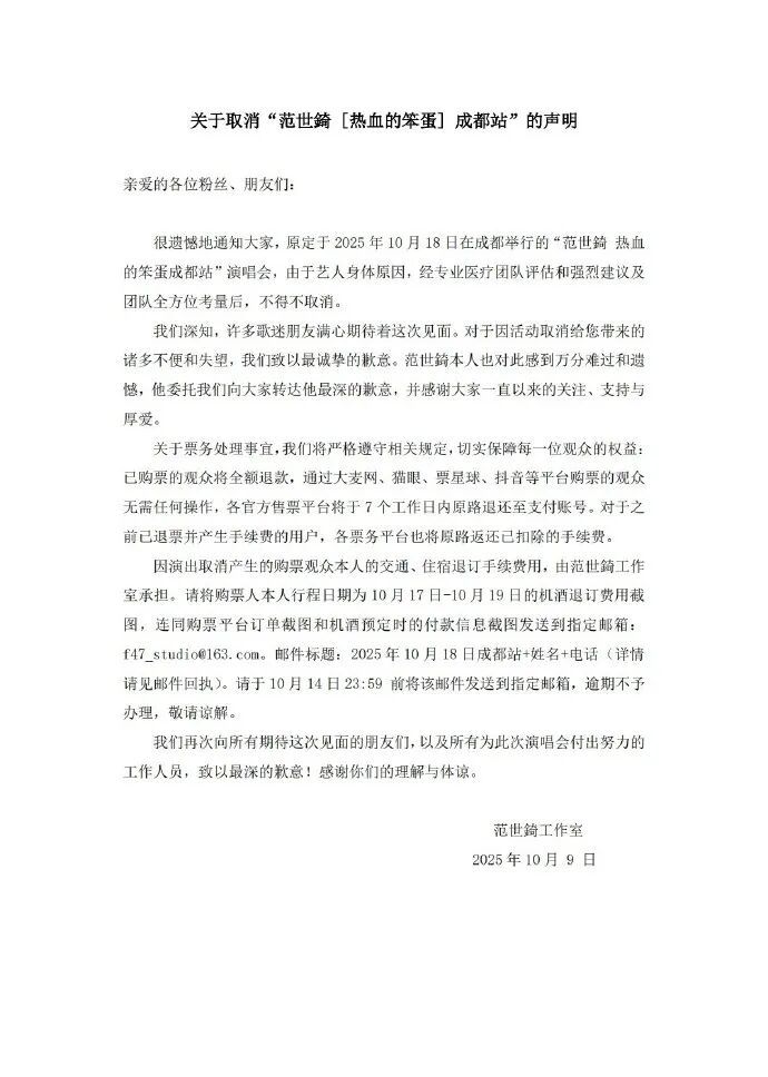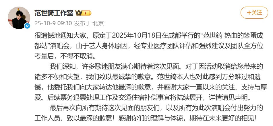10月9日,男星范世錡工作室發布聲明稱:原定于2025年10月18日在成都舉行的“范世錡 熱血的笨蛋成都站”演唱會,由于藝人身體原因,經專業醫療團隊評估和強烈建議及團隊全方位考量后,不得不取消。后續票務退票處理工作及交通住宿補償事宜將陸續展開。