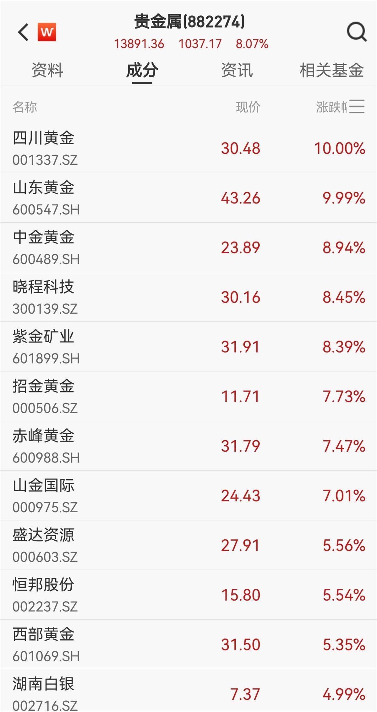 A股方面,10月9日黃金概念股開盤大漲。截至中午收盤,四川黃金漲停,山東黃金、中金黃金、招金黃金、紫金礦業、赤峰黃金等漲幅均在7%以上。
