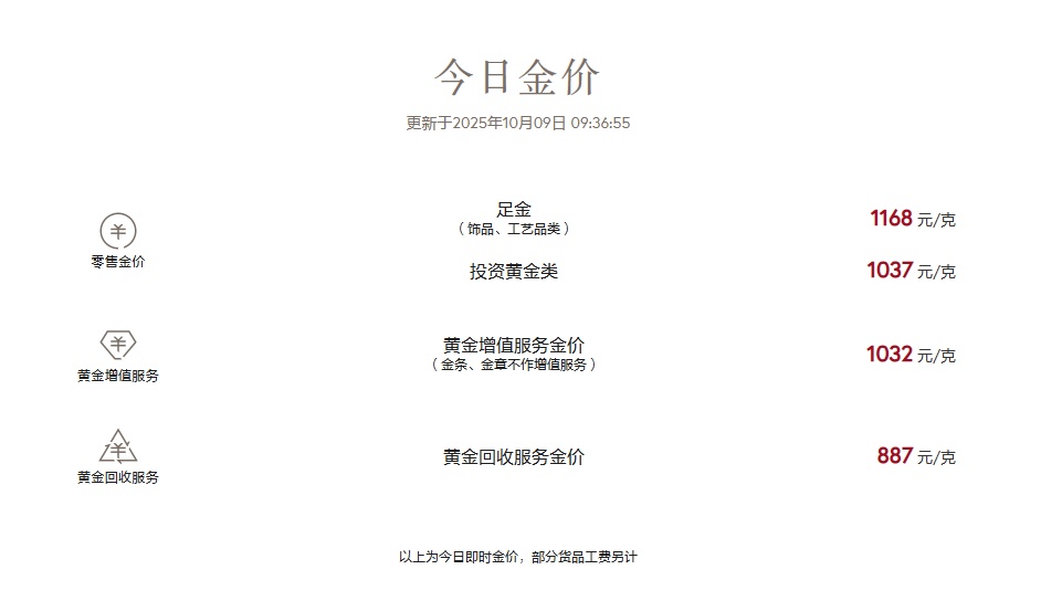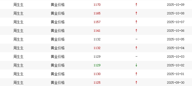 10月9日,周生生足金(飾品、工藝品類)克價沖上1170元,較國慶節前一天(9月30日)上漲45元;周福、六福足金克價均為1168元,較9月30日的1123元上漲45元;老廟黃金足金為1160元/克,較9月30日上漲34元/克;周六福、老鳳祥、潮宏基等品牌足金價格上漲幅度均在30至40元/克之間。