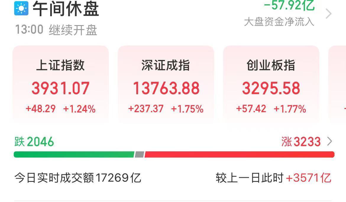 10月9日,節后首個交易日,在2.2億股民摩拳擦掌的期盼中,上證以凌云之勢騰空而起,高開近16個點一舉突破3900點整數關口。這也是時隔十年后,上證再度站上3900點。與此同時,受外圍多重利好的刺激,疊加A股節前良好的蓄勢,科創50、創業板也均跳空大漲。截至上午收盤,上證指數漲1.24%,深成指漲1.75%,創業板指漲1.77%,科創50漲5.59%、北證50漲0.25%。滬深京三市半日成交額17,269億元,較上日放量3571億元。全市場3200只個股上漲。