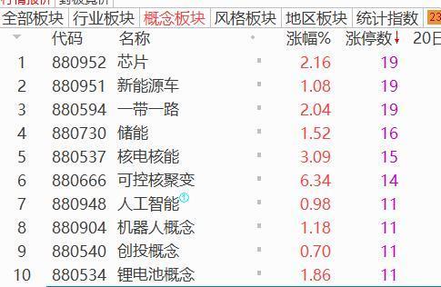 概念板塊方面,芯片、新能源車、“一帶一路”等板塊位居漲停前三名,分別錄得19只個股漲停。