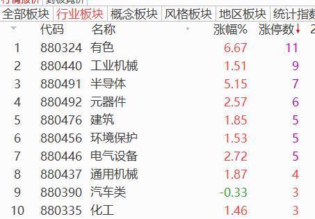 板塊題材方面,有色金屬、工業機械、半導體、元器件等漲幅居前,其中有色全線大爆發,錄得漲停板11個。
