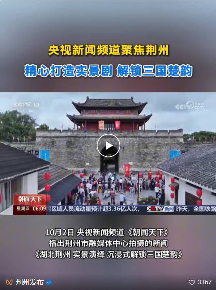 贊嘆的不只有游客,還有央省媒體,10月2日,以“開啟全新一天”聞名的央視新聞?lì)l道《朝聞天下》欄目刊播了《湖北荊州:實(shí)景演繹 沉浸式解鎖三國楚韻》,聚焦大北門《三國英雄路·入城儀式》,實(shí)景演繹讓靜態(tài)三國故事、歷史文化通過動(dòng)態(tài)演繹“活”起來的文化傳播新路徑。此外,學(xué)習(xí)強(qiáng)國、中國新聞網(wǎng)、湖北衛(wèi)視等知名媒體也紛紛報(bào)道,“千年一城滿風(fēng)華”項(xiàng)目成為假期的“熱點(diǎn)”。