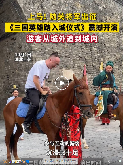 “誰愿隨我出征!”10月1日中午,大北門內(nèi)環(huán)道廣場上,“關(guān)羽”一身綠袍金甲,手持青龍偃月刀高聲吶喊,現(xiàn)場氣氛瞬間沸騰。游客李先生幸運(yùn)地被選中,跨上戰(zhàn)馬,手持令旗,隨“關(guān)羽”一同踏上“鎮(zhèn)守荊州”的征途。馬蹄聲碎,戰(zhàn)旗獵獵,“那一刻,很刺激,沉浸感十足,感覺自己真的走進(jìn)了三國。”李先生下馬后仍激動(dòng)不已。