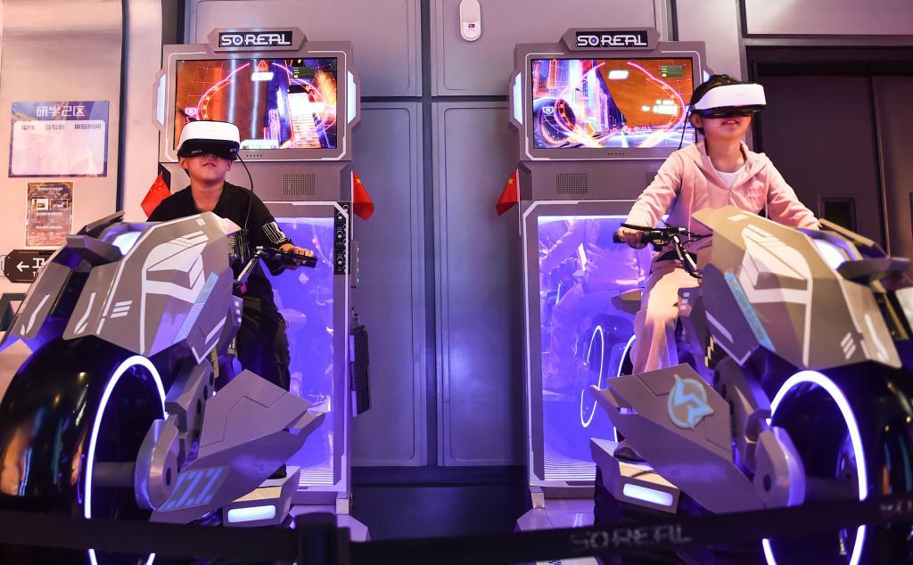 10月4日,在河南省洛陽市澗西區未來城科幻樂園內,孩子們在體驗VR虛擬技術沉浸式場景。新華社發(黃政偉攝)