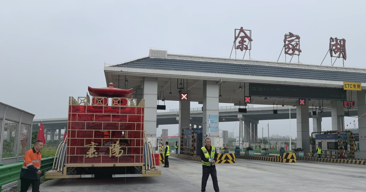 當日8 時10分,正值國慶高速免費通行的車流高峰,“俠義襄陽”花車在護衛車與拖車的牽引下,緩緩駛入余家湖收費站。然而,因花車車身超寬超長,到達車道口時無法正常通過,后方等待車輛逐漸積壓,現場通行壓力驟增。面對突發情況,余家湖收費站當班班長迅速反應,一邊開啟專用通道疏導后方車輛,避免擁堵加劇;一邊第一時間向值班領導匯報情況,并通知機動人員趕赴現場支援。值班領導與機動人員抵達現場,組成臨時應急小組。小組成員與花車運送人員充分溝通,快速制定出通行方案 —— 先將拖車與花車分體,為花車安裝臨時電機實現自主行駛,同時將原本的超寬自助通道切換為人工操作模式,確保花車通行過程安全可控。