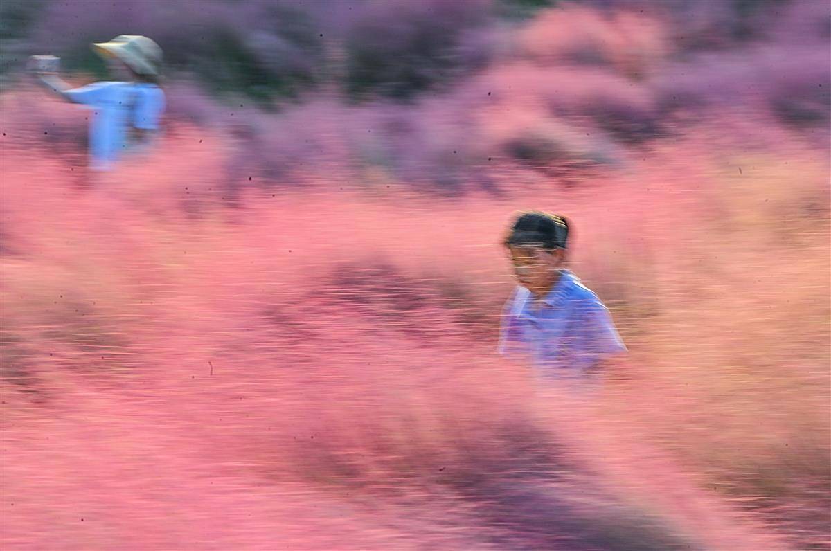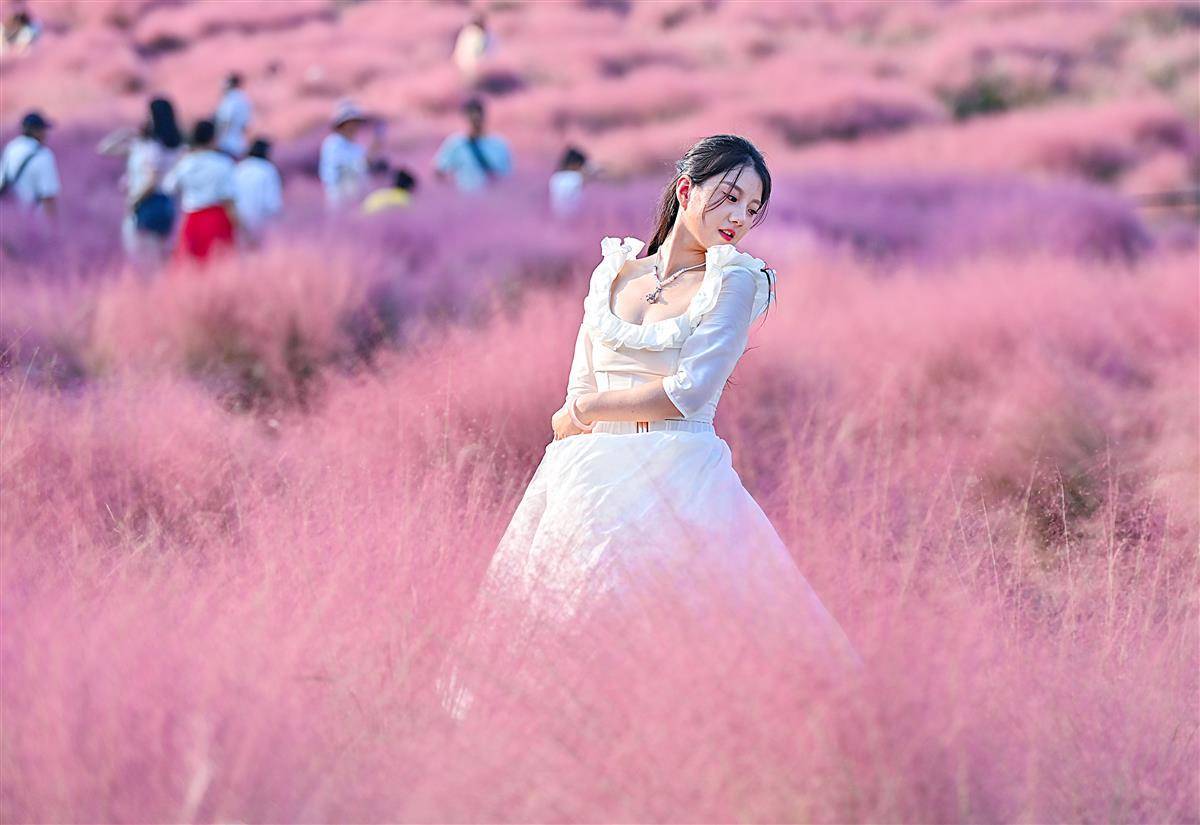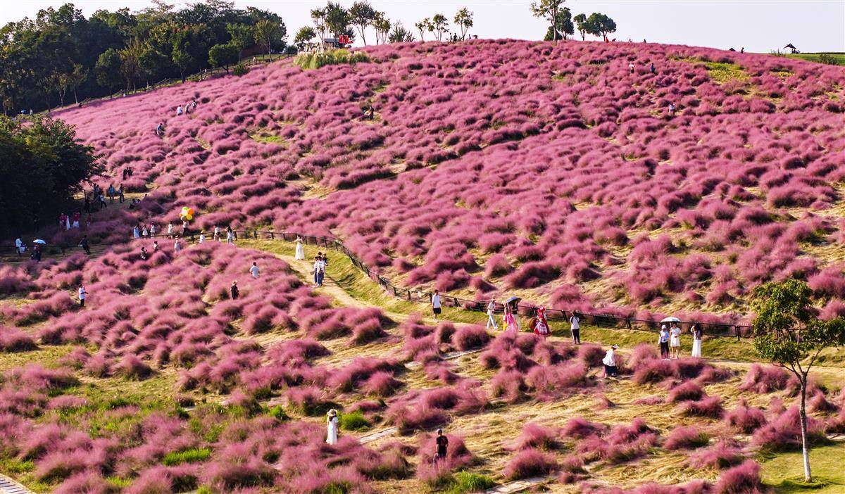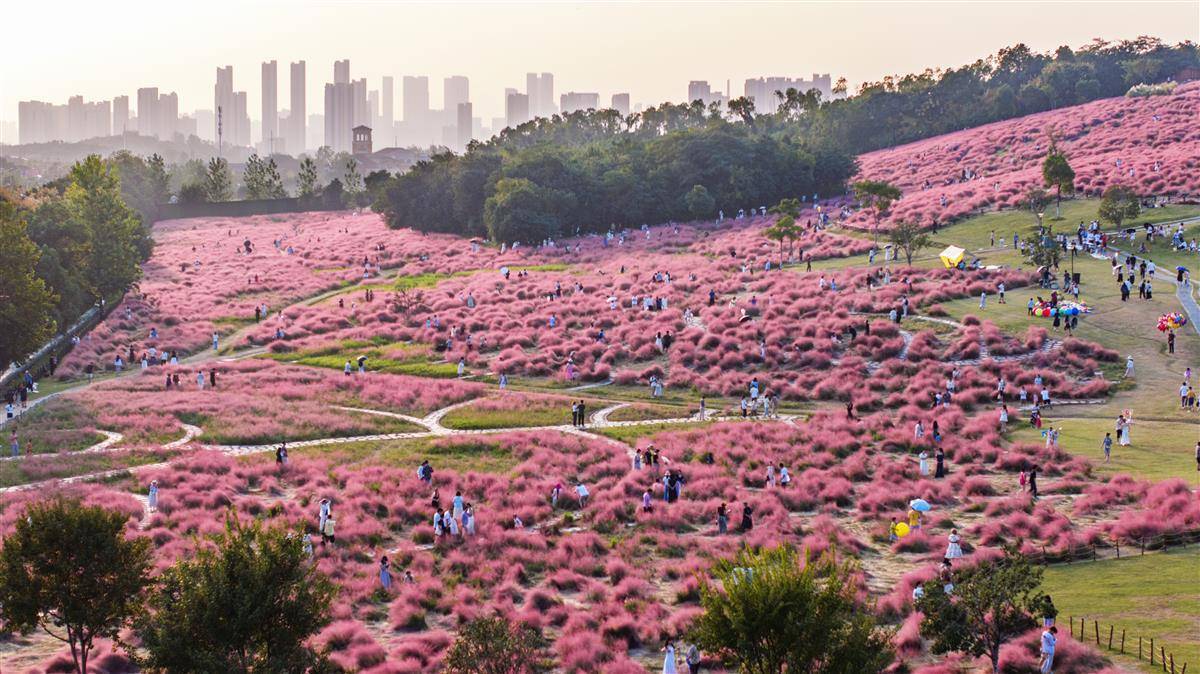 10月8日下午,許多市民游客抓住國慶長假最后一天,紛紛來到武漢光谷二妃山花海,欣賞日落美景,感受如云似霧的粉色浪漫。此處,被網友稱為出片率100%的網紅打卡地。(湖北日報全媒記者 朱熙勇 攝)