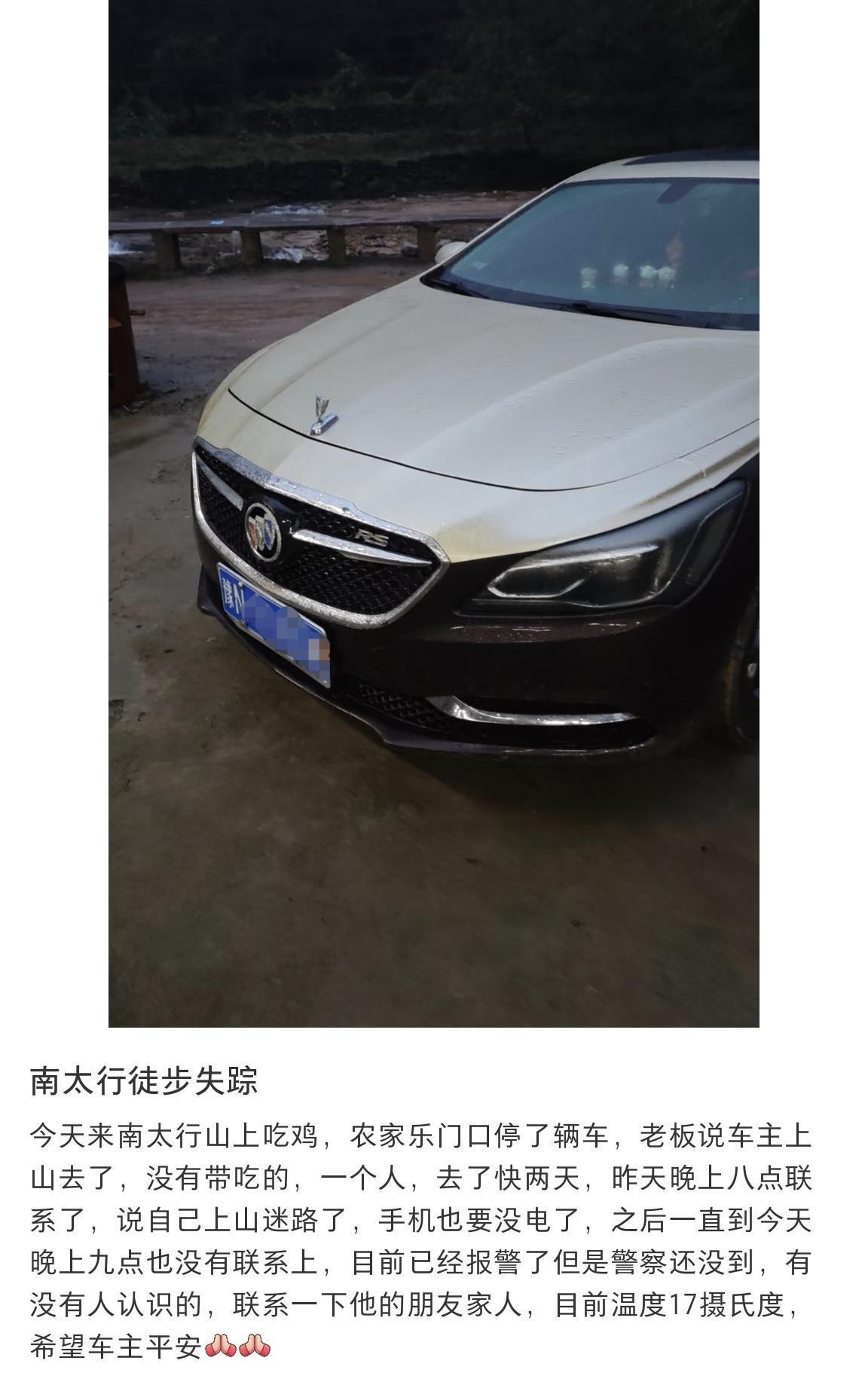 該網友還配發了失聯者停在農家樂門口的車輛,詢問有沒有人認識的,聯系一下他的朋友和家人。聽農家樂的老板說,這里上下山應該有三四個小時的路程,因為是沒有開發的區域,很少有人會往這里來,失聯者應該也是平時喜歡爬野山的人,他(失聯者)本來打算晚上住這個農家樂,晚上八點了還沒下山就給店家打了電話,說自己迷路了,手機又快沒電了。