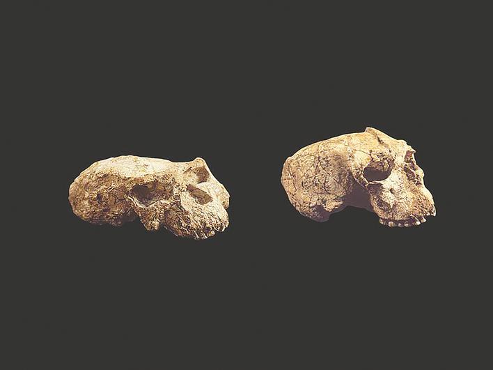 鄖縣人1號頭骨化石(左)、鄖縣人2號頭骨化石(右)。(受訪單位供圖)