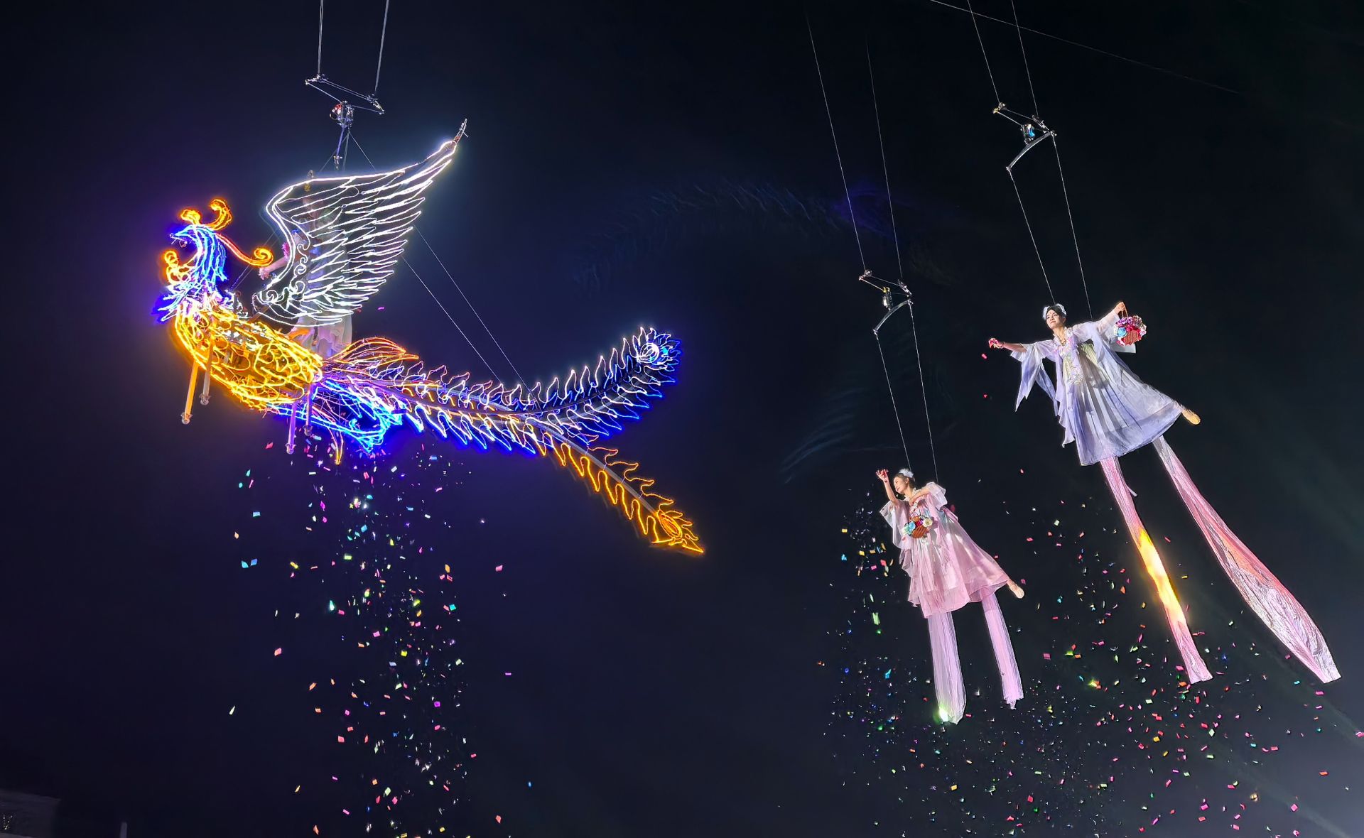 作為雙節期間的“人氣擔當”,唯美夢幻的飛天秀將當晚氛圍推向高潮。表演者于夜空中翩躚起舞,衣袂飄飄,宛若嫦娥臨凡,與天際明月共同繪就一幅絕美畫卷,為中秋之夜注入了極致的浪漫與想象。