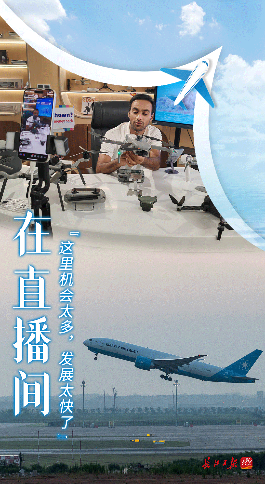 阿布所在直播間的運營者錢嶺,也是被花湖機場吸引而來。今年5月,這位來自武漢的創業者成立了騰達國際貿易鄂州有限公司。僅兩個月,團隊就壯大到20人。“我們的貨,就是通過機場‘買全國、賣全球’。”