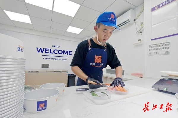 海里家里鄂州店老板衛國鋒在將切好的三文魚裝盤。 長江日報記者史偉 攝
