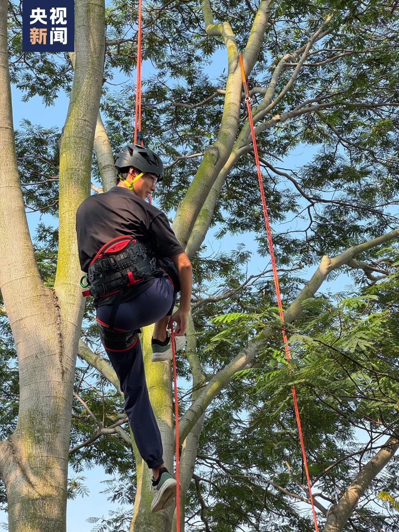 鄭達雄介紹:“攀樹師不僅要熟練使用各類攀樹裝備與器械,還需了解樹木養護、病蟲害防治等樹木學知識。同時,良好的運動能力和體力也是重要的職業素質。”